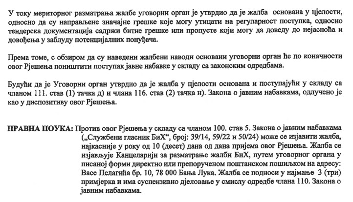 „U toku meritornog razmatranja žalbe ugovorni organ je utvrdio da je žalba osnovana u cjelosti, odnosno da su napravljene značajne greške koje mogu uticati na regularnost postupka. Tenderska dokumentacija sadrži bitne greške ili propuste koji mogu da dovedu do nejasnoća i dovođenja u zabludu potencijalnih ponuđača“, navodi se u obrazloženju rješenja „Autoputeva RS“.