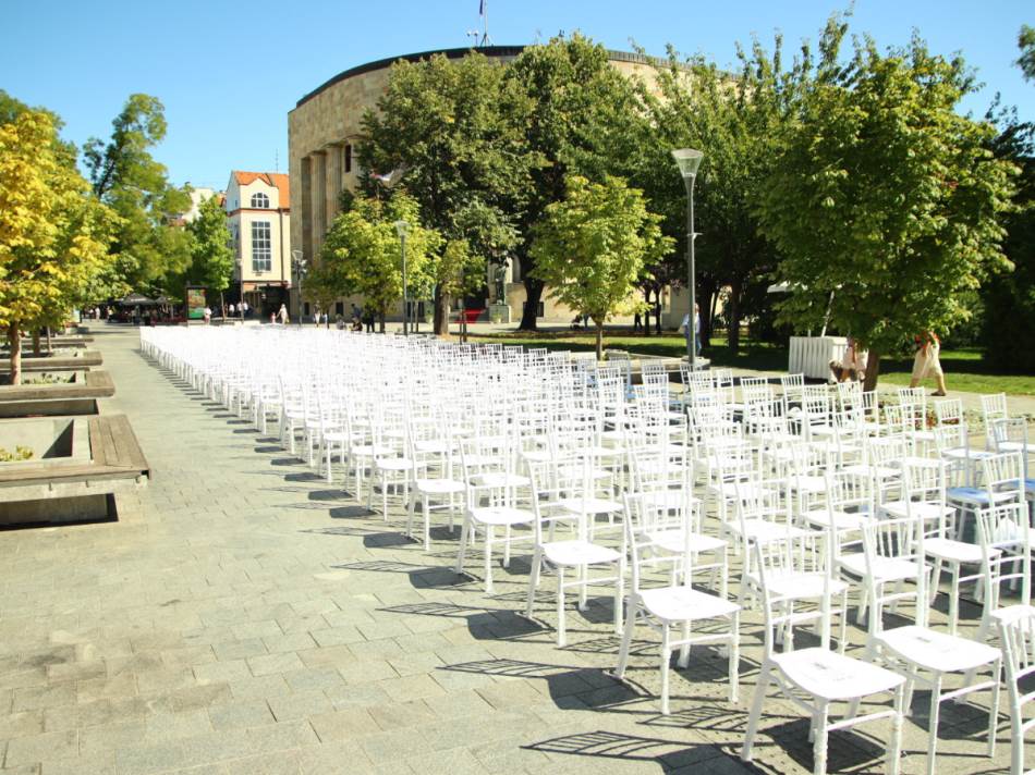 U centru Banjaluke postavljeno je 1616 praznih stolica, sa imenima nestalih civila i vojnika u ratu, koji nikad nisu pronađeni.