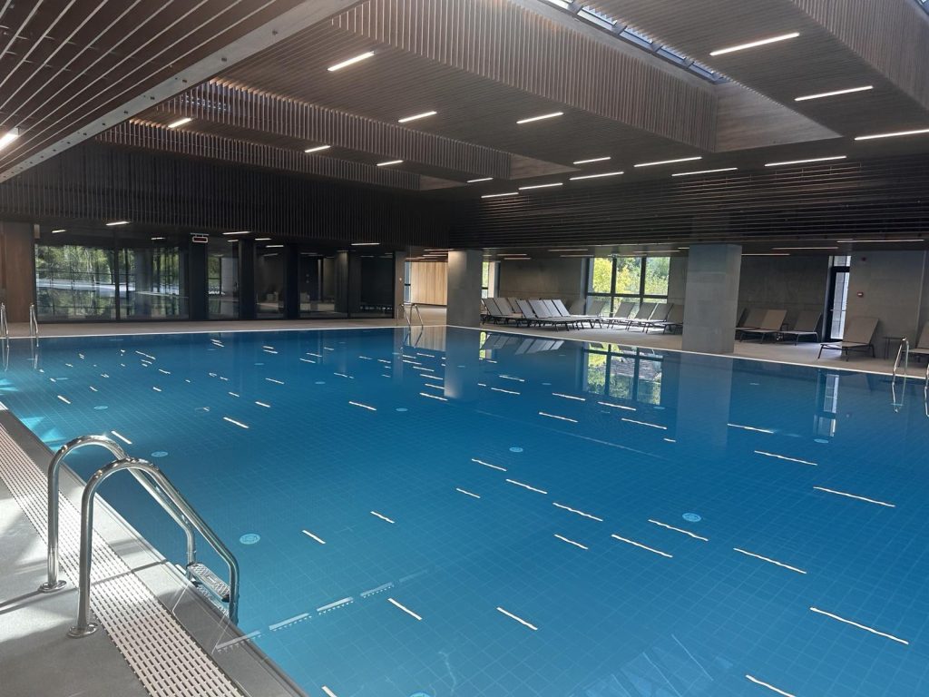 U prizemlju je unutrašnji bazen sa proplivavanjem u vanjski bazen, zatim dječji bazen, svijet sauna, relaks zona sa tepdarijumima i ležajevima za relaksaciju, spa suit za maksimalno osam osoba, kafić i restoran, te igraonica.
