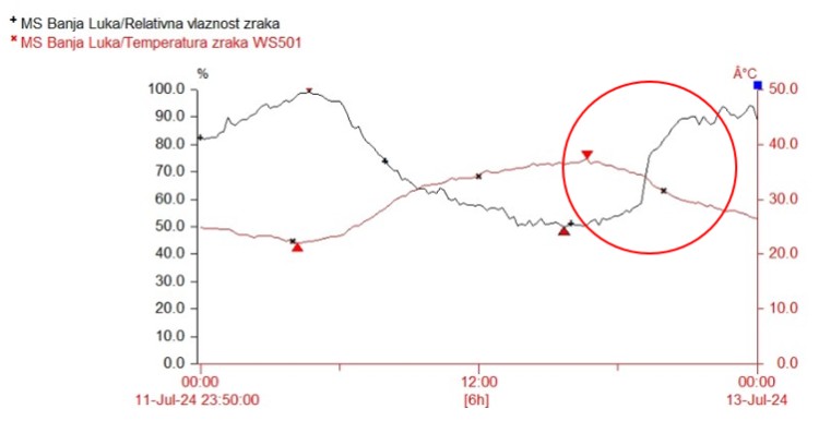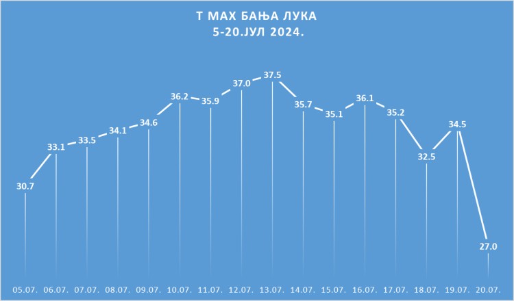 "Od petog do 19. jula u Banjaluci maksimalna temperatura svakog dana prelazila je iznad 30 stepeni, a poslije 15 dana 20.07. temperatura se spustila ispod 30 stepeni. Posebno je bilo toplo i sparno od 12. do 14. jula uveče kada je temperatura u 22 časa iznosila čak 30 stepeni", naveli su oni.