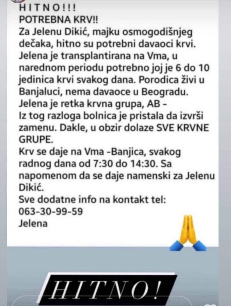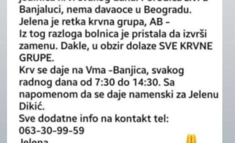 – Jelena je rijetka krva grupa – AB. Iz tog razloga bolnica je pristala da izvrši zamjenu. Iz tog razloga u obzir dolaze sve krvne grupe – piše u apelu.