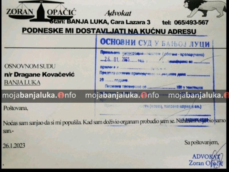 Banjolučki advokat Zoran Opačić poslao je sudiji Osnovnog suda u ovom gradu Dragani Kovačević putem protokola dopis vulgarnog sadržaja.