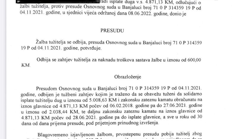 “Imajući to u vidu, njegov dug po osnovu kredita trebalo bi da isplati osiguravajuća kuća, odnosno Croatia osiguranje. Osiguravajuća kuća koja je sa bankom imala ugovor o tehničkoj saradnji, imala je mogućnost da utvrdi zdravstveno stanje osiguranika, o čemu je i prvostepeni sud dao jasno i decidno obrazloženje“, odlučio je Okružni sud Banjaluka.