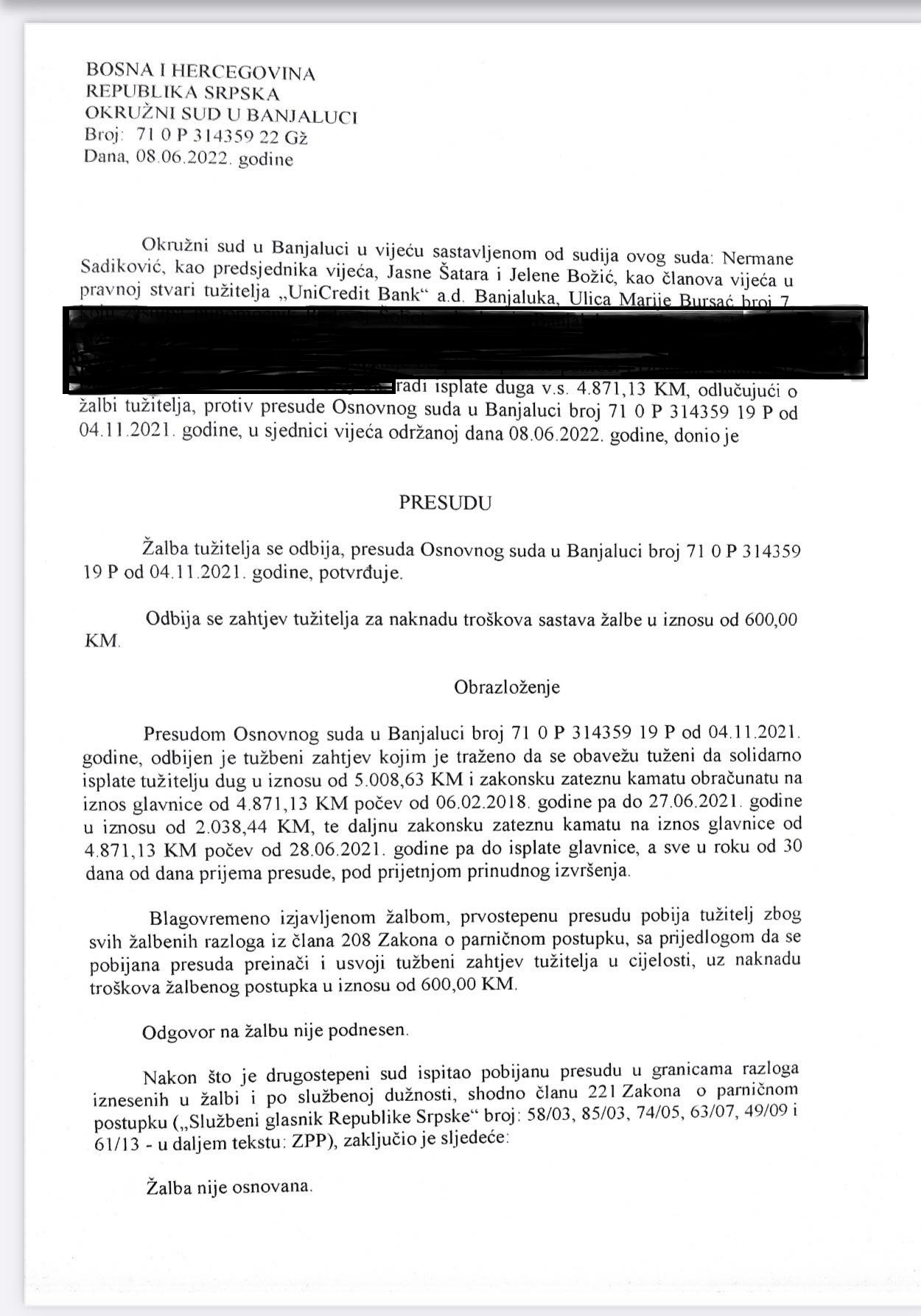 Njegove tvrdnje potkrepljuje i presuda Okružnog suda u Banjaluci koji je odbio tužbeni zahtjev u kojem je UniCredit banka Banjaluka u dva navrata pokušala od nasljednika da naplati 5.000 maraka, ono što je bila dužna da traži od Croatia osiguranja koji je izdao polisu za osiguranje kredita. Utvrđeno je da, s obzirom na to da je postojalo životno osiguranje, ne postoji odgovornost nasljednika.