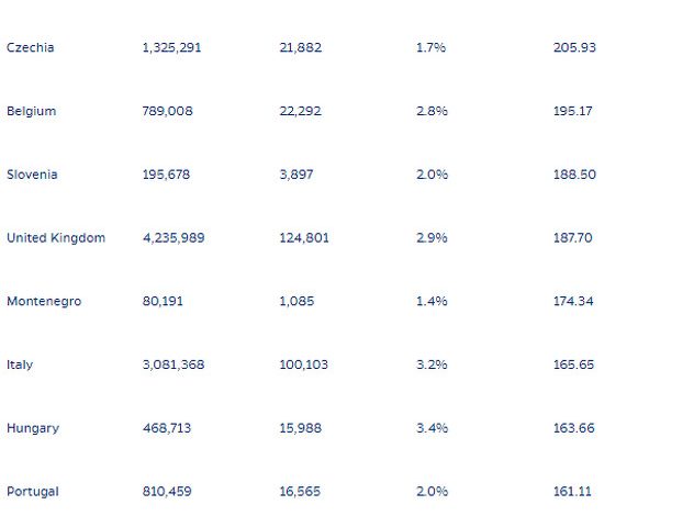 Na samom vrhu ove liste je San Marino (224 preminulih na 100.000 stanovnika), a slijede Češka (205), Belgija (195), Slovenija (188), Velika Britanija (187), Crna Gora (174), Italija (165), Mađarska (161), Portugal (161) i SAD (160).