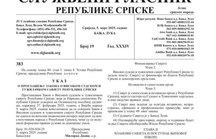 Ukaze o proglašenju ovih zakona sinoć je potpisao predsjednik Republike Srpske Milorad Dodik, a oni su potom objavljeni u "Službenom glasniku Republike Srpske".