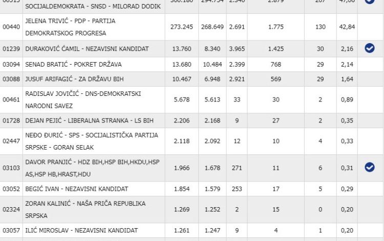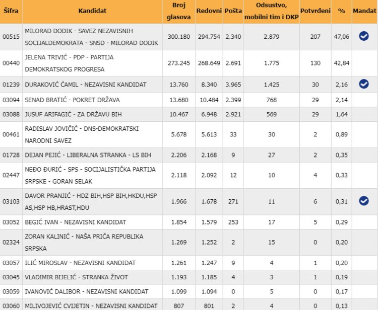 Prema tim rezultatima, Milorad Dodik, kandidat SNSD-a, osvojio je 300.180 glasova (47,06 odsto), dok je Jelena Trivić, kandidat PDP-a, osvojila 273.245 glasova (42,84 odsto).
