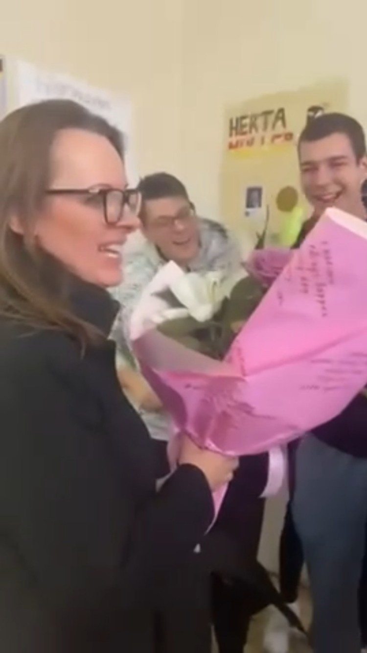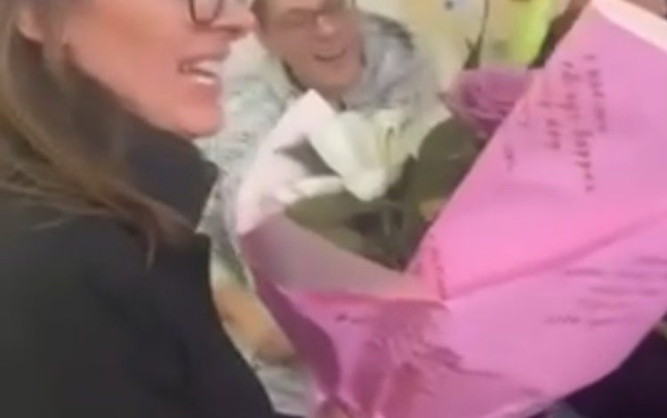 Kako se vidi na snimku, nastavnica je utrčala u učionicu kako bi razdvojila učenike koji su se "tukli", no dočekalo je iznenađenje, kada u okupljenoj gomili dočekao buket cvijeća.