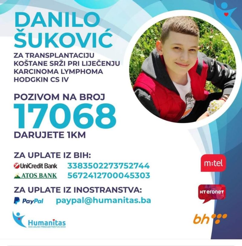 Osim toga, za Danilovo liječenje moguće su uplate iz BiH na račun UniCredit Banke 3383502273752744 i Atos banke 5672412700045303. Za uplate iz inostranstva paypal@humanitas.ba