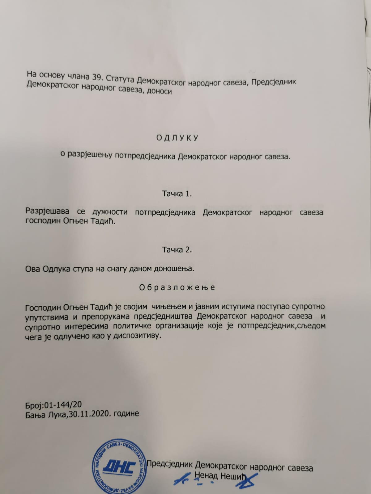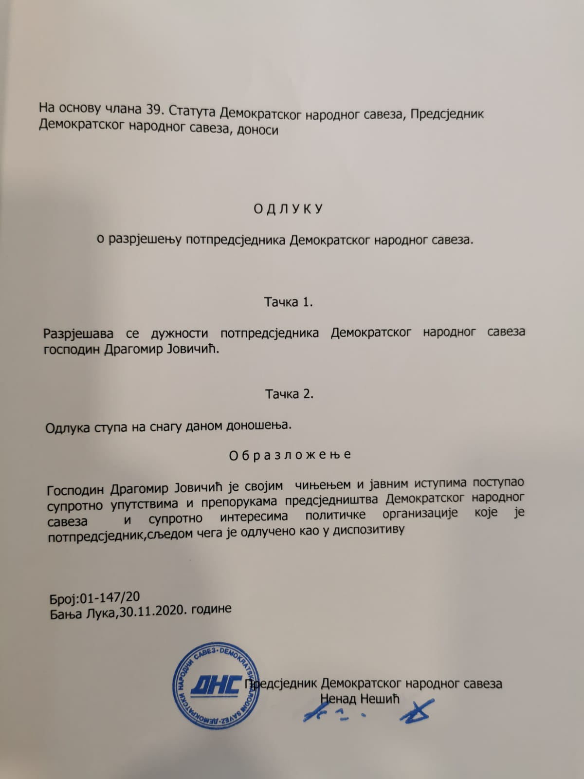 Predsjednik DNS Nenad Nešić danas smijenio tri potpredsjendika stranke.