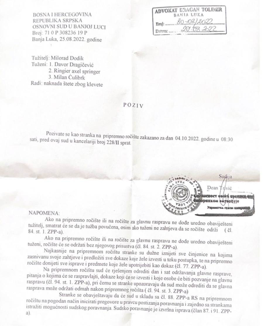 Iako je Dragičević danas dobio poziv iz Osnovnog suda, pripremno ročište je zakazano već za 4.oktobar, odnosno kroz šest dana piše Blink.