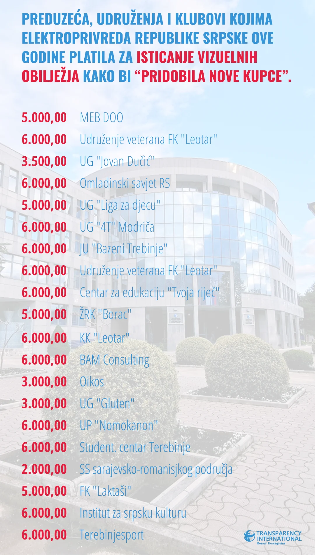 Matično preduzeće Elektroprivrede Republike Srpske ove godine planira da potroši 680 000 KM za reklamu i propagandu iako i dalje ima potpuni monopol na domaćem tržištu električne energije.Od početka ove godine platili su skoro 100 000 KM bez PDV-a brojnim udruženjima i sportskim klubovima za isticanje vizuelnih obilježja a ni za jednu od tih nabavki nisu raspisali tender.Među dobavljačima ovih usluga našli su se udruženje korisnika voda za navodnjavanje " VUČIJA", Omladinska organizacija "DELTA", Organizacija kreativnog okupljanja Nevesinje, Institut za srpsku kulturu iz Nikšića, omladinska organizacija "Mreža mladih”, Udruženje “Pozitiva” itd
