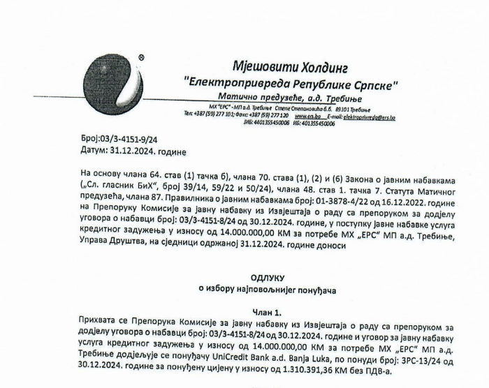 Prvo je u ponedjeljak 30. decembra direktor Luka Petrović potpisao odluku o kreditu od 14 miliona maraka kod „Unicredit banke“ Banjaluka.
