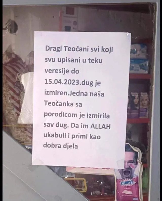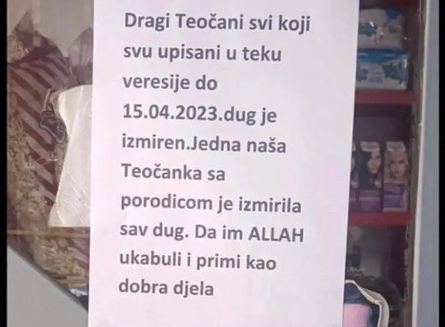 – Dragi Teočani svi koji su upisani u teku veresije do 15.04.2023. dug je izmiren. Jedna naša Teočanka sa porodicom je izmirila sav dug. Da im Allah ukabuli i primi kao dobra djela – stoji na natpisu.