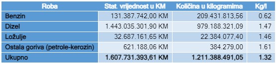 Prema podacima Uprave za indirektno oporezivanje BiH u prvih devet mjeseci ove godine najviše je uvezeno dizela-1,4 milijardi litara, ako se uzme da je prosječna cijena dizela 2,3 KM po litru, samo na dizel građani i privreda u BiH izdvojili su preko tri milijarde KM (3.310.635.711 KM). Benzina je potrošeno 129,8 miliona litara, a ako se uzme prosječna cijena od 2,2 KM, za ovo gorivo je utrošeno 285,6 miliona maraka. Na lož ulje, koje se najmanje koriti, utrošeno je oko 60 miliona KM.