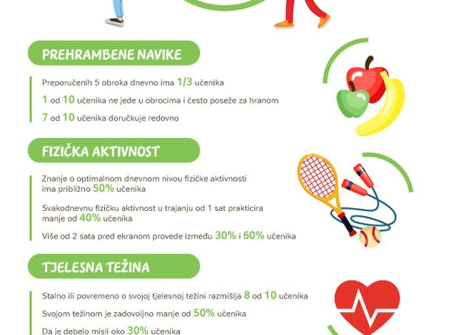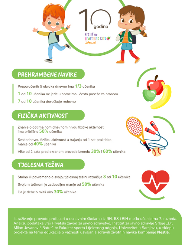 Istraživanje pokazuje da, prosječno, svega trećina djece u regiji ima preporučenih 5 obroka dnevno, čak 1 od 10 njih ne jede u obrocima, dok su s druge strane dobri pokazatelji da redovno doručkuje 7 od 10 djece. Znanje o optimalnom dnevnom nivou tjelesne aktivnosti posjeduje približno 50% djece, ali svejedno je minimalno 60 minuta dnevno tjelesno aktivno manje od 40% njih. Svojom tjelesnom težinom zadovoljno je nešto manje od 50% djece, a čak 8 od 10 njih stalno ili povremeno razmišlja o svojoj težini, prenosi Klix.ba.