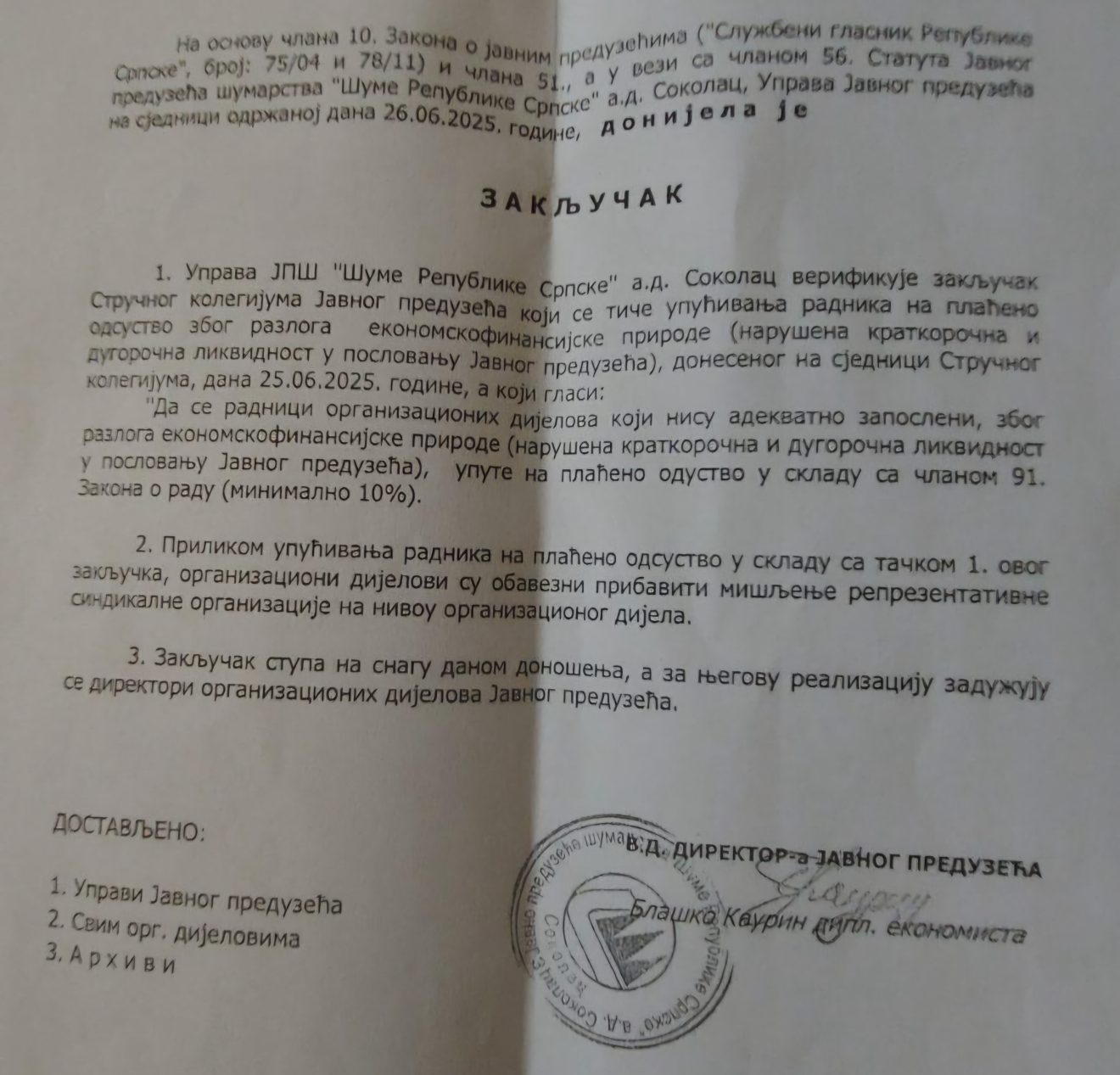 Stručni kolegijum „Šuma“ donio je nedavno zaključak u čijem posjedu je naš portal koji je verifikovala i uprava da se minimalno deset odsto radnika iz svake organizacione jedinice ovog javnog preduzeća zbog kratkoročno i dugoročno narušene likvidnosti upućuju na plaćeno odsustvo ili popularnije „na čekanje“ na kojem primaju 50 odsto plate.
