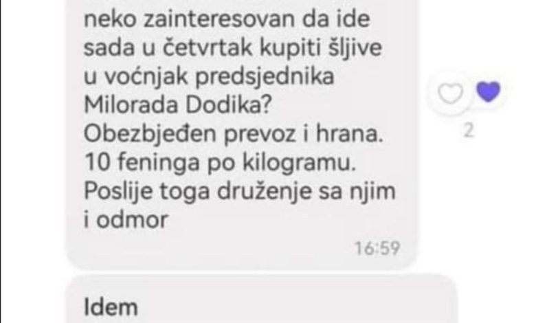 Poziv Aleksandra Babića, odbornika SNSD u Skupštini opštine Srbac, članovima Opštinskog odbora da danas dođu u “voćnjak predsjednika Milorada Dodika” kako bi kupili šljive izazvao je veliku pažnju u javnosti.