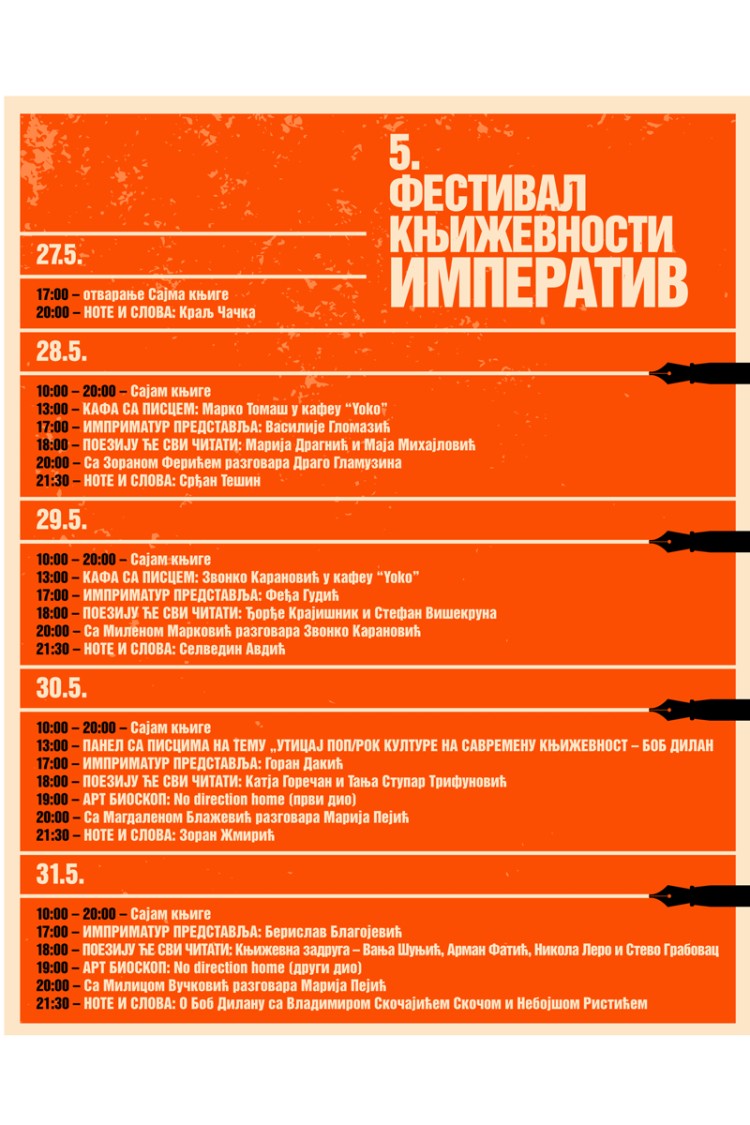 Oprečni stavovi da li je Dilanova poezija književnost ili nije i danas su tema svjetske književne kritike. Tokom pet dana Banja Luka će biti književni centar u kojem će se okupiti više od 30 značajnih domaćih i regionalnih pisaca. Njihov rad biće predstavljen kroz pet programskih sadržaja – saopšteno je iz Udruženja za promociju i popularizaciju književnosti "Imperativ".
