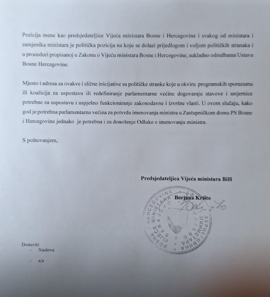 “Pozicija mene kao predsjedateljice Vijeća ministara BiH i svakog od ministara i zamjenika ministara je politička pozicija na koju se dolazi prijedlogom i voljom političkih stranaka u proceduri propisanoj u Zakonu o Vijeću ministara BiH, sukladno odredbama Ustava BiH. Mjesto i adresa za ovakve i slične inicijative su političke stranke koje u okviru programskih sporazuma ili koalicija za uspostavu ili redefiniranje parlametarne većine dogovaraju stavove i smjernice potrebne za uspostavu i uspješno funkcionisanje zakonodavne i izvršne vlasti. U ovom slučaju, kako god je potrebna parlamentarna većina za potvrdu imenovanja ministra u Zastupničkom domu PS BiH jednako je potrebna i za donošenje Odluke o imenovanju ministra”, poručila je nedavno Krišto predstavnicima “trojke”.