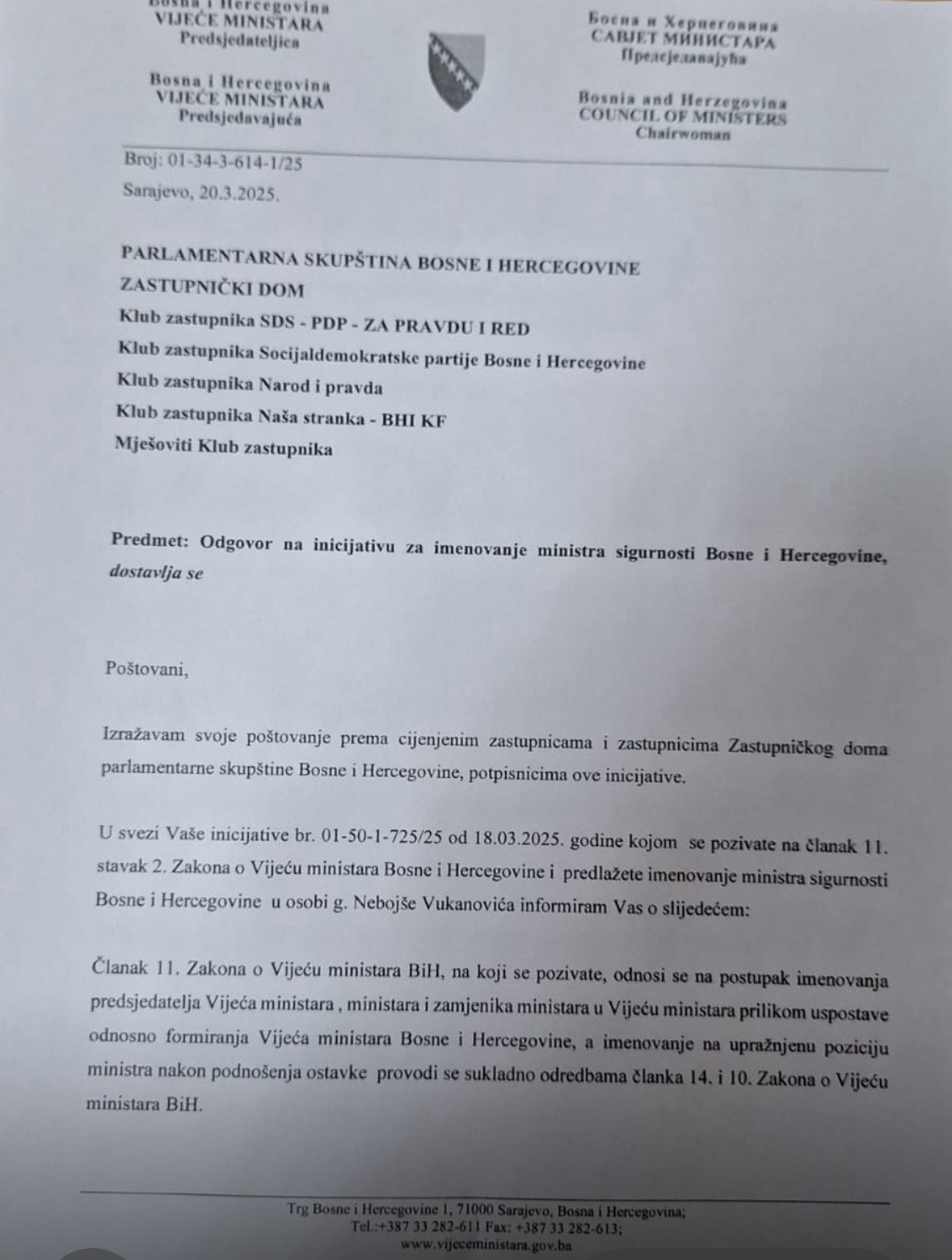 Šefovi pet klubova Predstavničkog doma Parlamentarne skupštine BiH uputili su inicijativu predsjedavajućoj Savjeta ministara BiH Borjani Krišto (HDZ) da pošalje u proceduru imenovanje Nebojše Vukanovića, lidera Liste za pravdu i red za ministra bezbjednosti BiH.