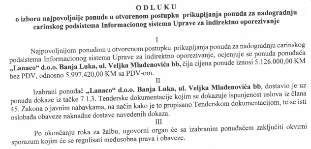 – Najpovoljnijom ponudom u otvorenom postupku prikupljanja ponuda za nadogradnju carinskog podsistema informacionog sistema UIO, ocjenjuje se ponuda ponuđača Lanaco“ čija cijena iznosi 5,12 miliona KM bez PDV-a, odnosno 5,99 miliona KM sa PDV-om – navedeno je u odluci UIO.
