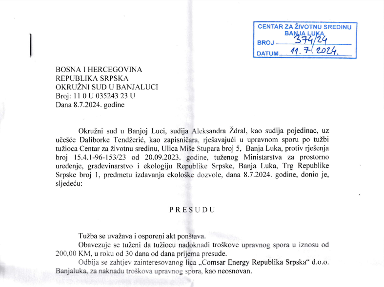 “Tuženi je trebao ostati kod zaključka kojim je prekinut postupak za izdavanje ekološke dozvole, do njegovog okončanja”, navodi se u presudi.