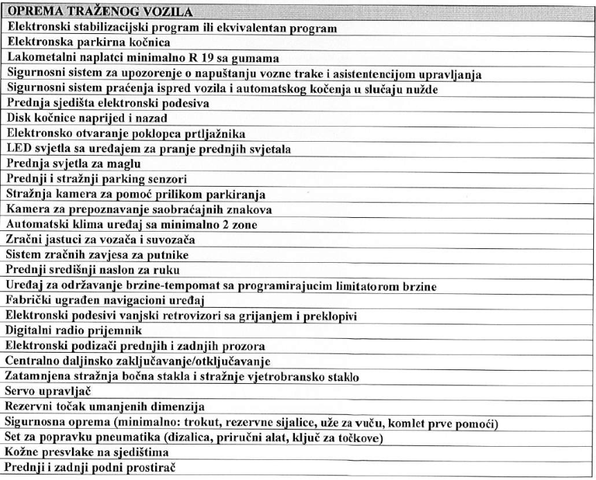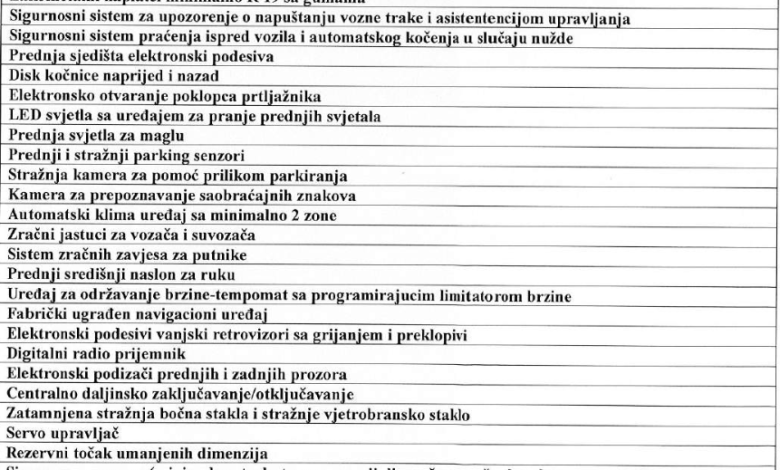 Pored standardne opreme novi automobil mora da ima i kameru za prepoznavanje saobraćajnih znakova, zatamnjena stakla, kožne presvlake, sistem za upozorenje o napuštanju vozne trake te automatsko kočenje u slučaju nužde.