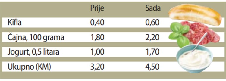 Kifla, umjesto nekadašnjih 40 feninga, sada košta 60, a 100 grama čajne kobasice je sa 1,80 poskupjelo na 2,20 KM. Dodajmo tome i pola litra jogurta, koji smo plaćali jednu marku, a sada je 1,70 KM.