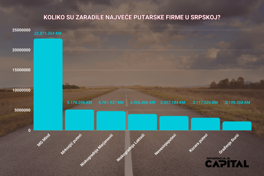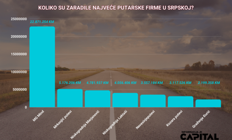 Najveće putarske firme u Republici Srpskoj obrnule su prošle godine oko 287 miliona maraka, a najveći prihod od 89,8 miliona KM svakako je imalo preduzeće „MG mind“, saznaje CAPITAL.