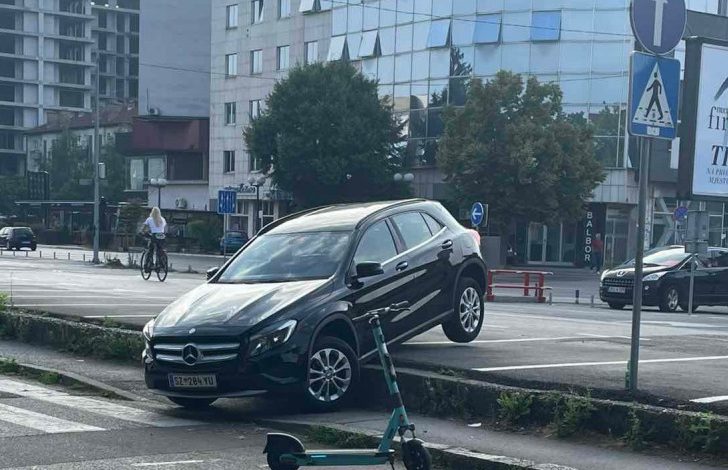 Na fotografiji se jasno vidi da je riječ o vozilu marke Mercedes GLA, koje doslovno "visi" preko ivice parkinga, sa jednim točkom podignutim u vazduh.