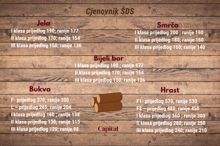 Kubik smrče prve klase poskupio je za deset maraka po kubiku i sada košta tačno 200 KM, druga klasa umjesto dosadašnjih 160 sada košta 180 KM, a cijena treće klase je sa 140 skočila na 160 KM.