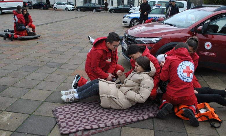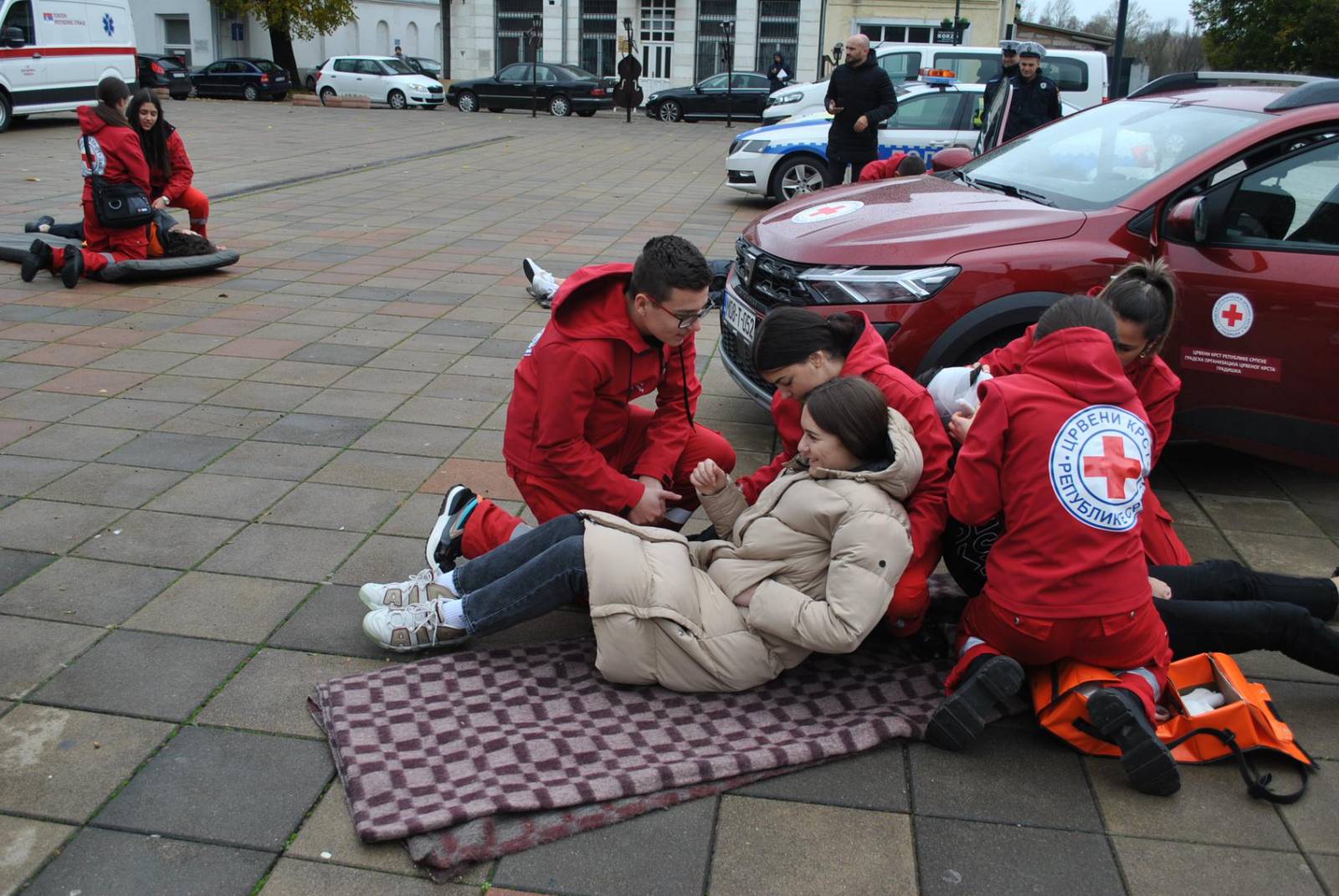 Članovi Kluba mladih Crvenog krsta Gradiška izveli su pokaznu vježbu u pružanju prve pomoći u slučaju saobraćajne nezgode, dok su pripadnici saobraćajne policije obezbjeđivali lice mjesta i radili uviđaj saobraćajne nezgode.