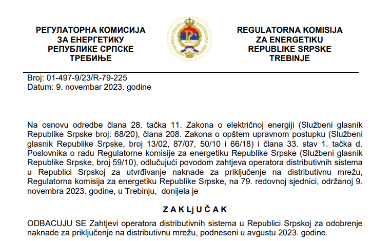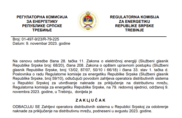 – Ova aktivnost utiče na sve korisnike distributivne mreže, pa kako na one korisnike čiji su objekti već priklјučeni na elektrodistributivnu mrežu tako i na one koji će se ubuduće priklјučivati na mrežuZbog toga, ovaj trošak se ne može obračunavati samo budućim korisnicima distributivnog sistema – navodi regulator.