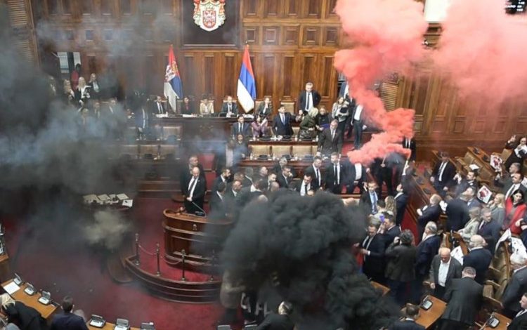U Skupštini Srbije danas je došlo do nereda i tuče, pošto su poslanici opozicije, nakon usvajanja dnevnog reda na sjednici Skupštine, u sali bacili dimne bombe i upalili baklje. Poslanici opozicije gađali su raznim predmetima poslanike poslaničke grupe "Aleksandar Vučić – Srbija ne sme da stane", a galamom, zviždanjem i duvanjem u pištaljke i vuvuzele pokušavaju da onemoguće rad Skupštine Srbije.