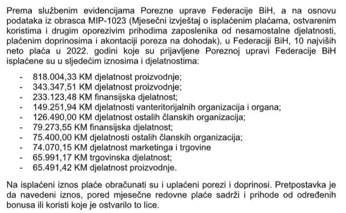 U FBiH na prvom mjestu je plata od čak 818.000 KM, a isplaćena je u djelatnosti proizvodnje. Poređenja radi, neko sa prosječnim primanjima za ovoliko novca treba raditi skoro 60 godina. Slijede 343.347 KM iz iste djelatnosti, 233.123 (finansijska djelatnost), 149.251 (djelatnosti vanteritorijalnih organizacija i organa) i 126.490 (djelatnost ostalih članskih organizacija).