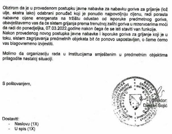 – Prema trenutnoj zalihi lož ulja sistem grijanja će biti u funkciji do 7. marta nakon čega će se staviti van funkcije. Nakon sprovedeno novog postupka javne nabavke biće ponovo uspostavljen sistem zagrijavanja navedenih objekata – navodi se u obavijesti Službe za zajedničke poslove.