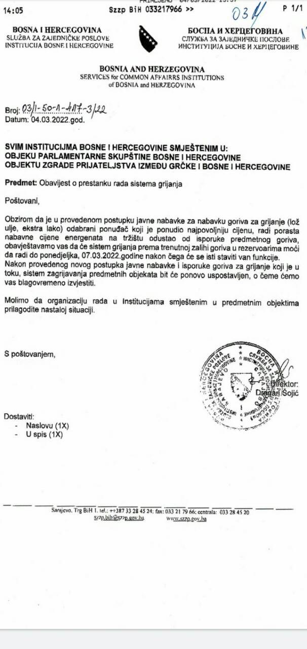 Direktor Službe za zajedničke poslove institucija BiH Dragan Šojić obavijestio je sve institucije smještene u objektu Parlamenta i zgradi prijateljstva Grčke i BiH u kojima je smješten i Savjet ministara da je najpovoljniji ponuđač za nabavku lož ulja zbog porasta nabavne cijene odustao od isporuke ovog energenta.