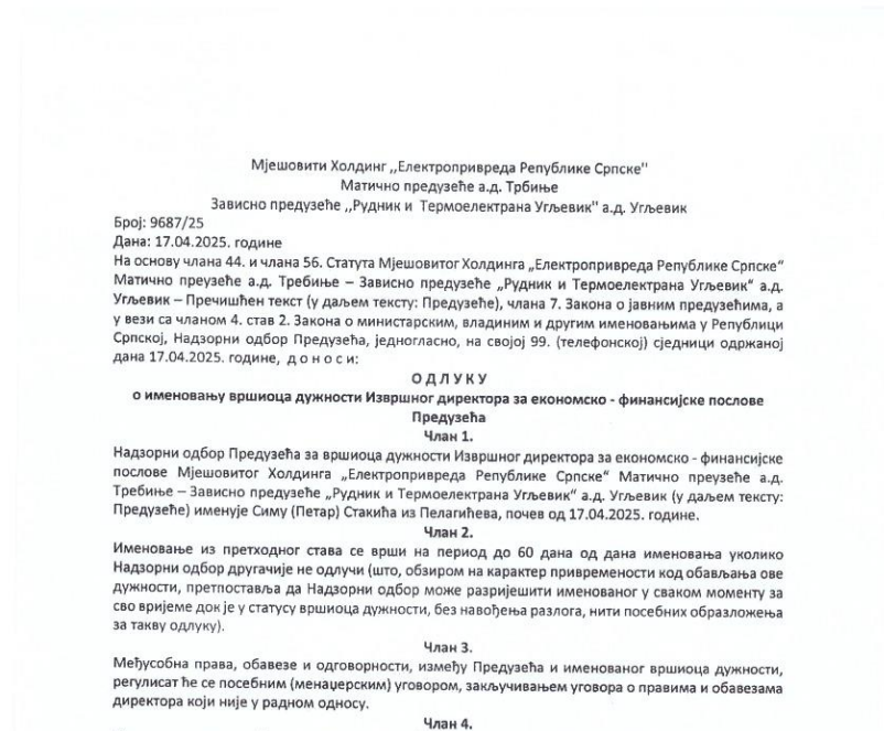 Naime, Nadzorni odbor je 8. aprila ove godine na telefonskoj sjednici donio odluku o razrješenju Stakića sa pozicije vršioca dužnosti izvršnog direktora za ekonomsko – finansijske poslove.