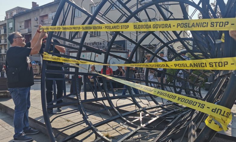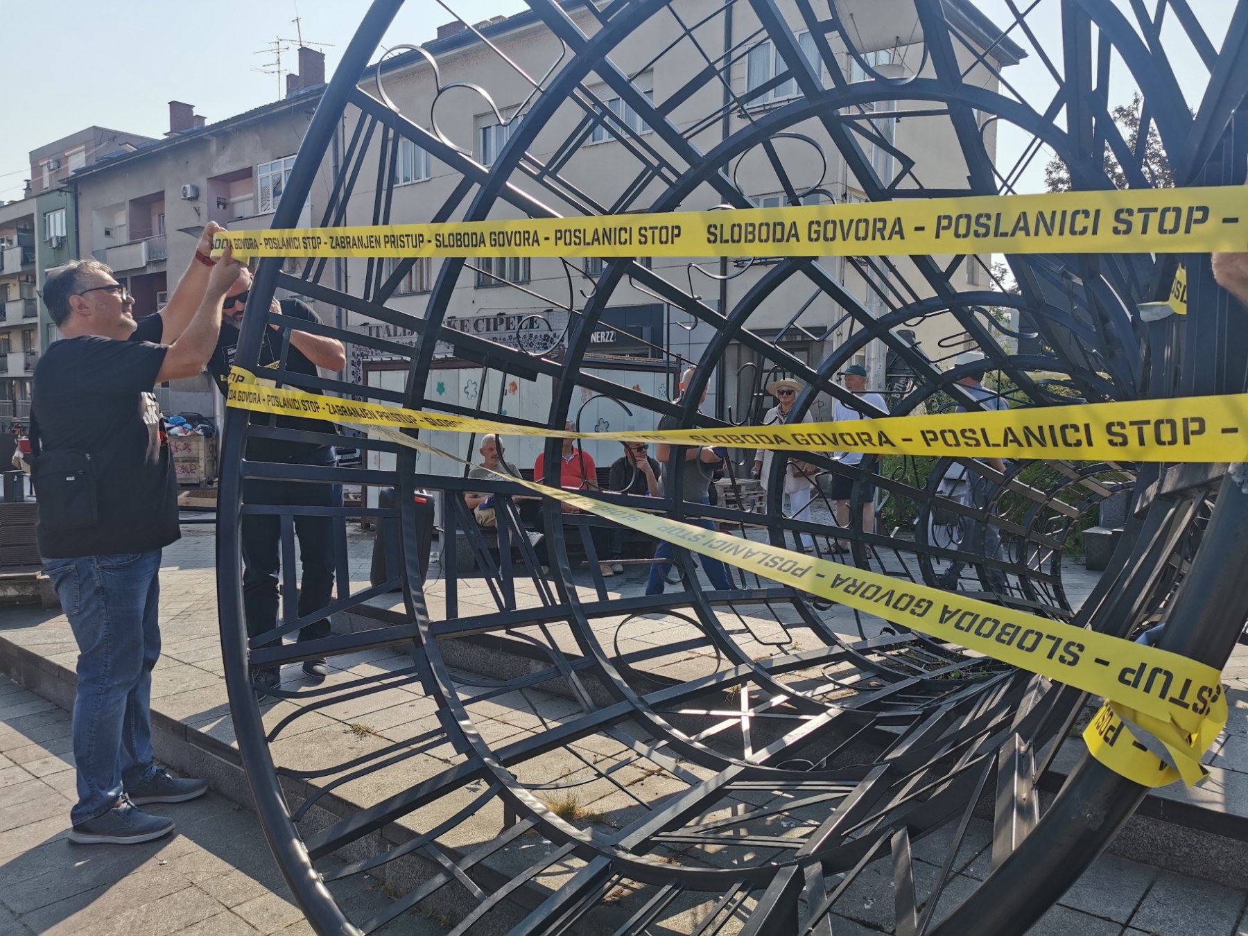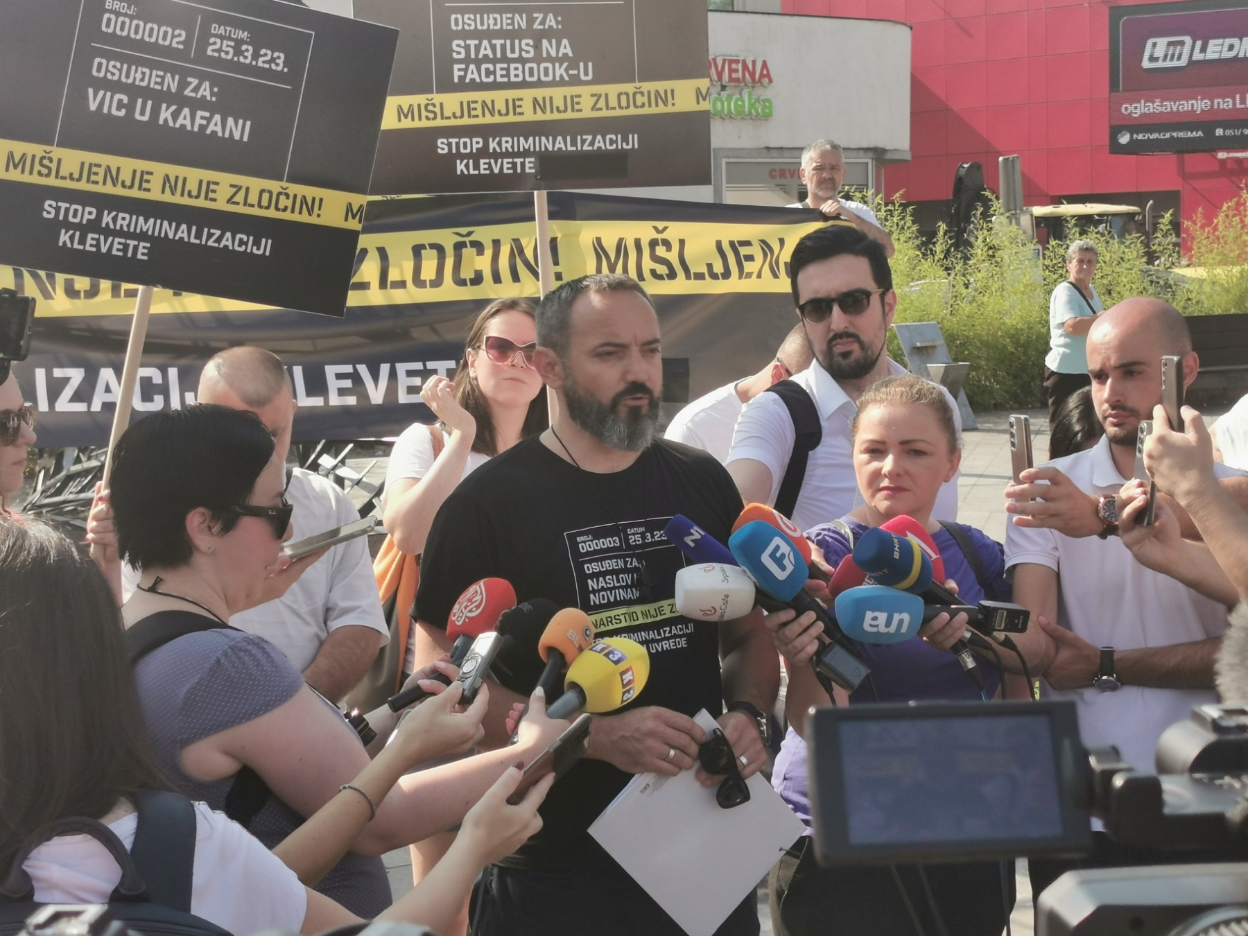 Predstavnici slobodnih medija i civilnog društva okupili su se kod megafona na Trgu Krajine u znak protesta prije sjednice Narodne skupštine Republike Srpske zbog namjere vlasti da u Krivični zakonik RS uvedu klevetu.