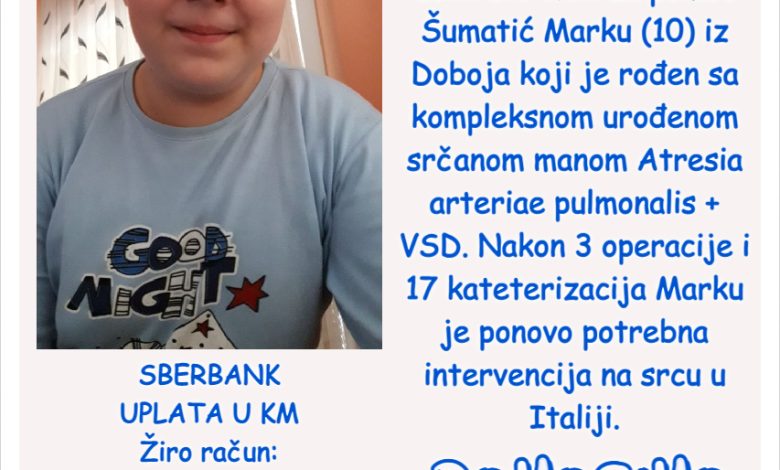 Broj je pokrenut za pomoć u liječenju u Italiji desetogodišnjeg Marka Šumatića iz Doboja koji je rođen sa izuzetno teškom srčanom manom, pomoć za putovanja na redovne kontrole u Italiju i u BiH kao i za sve ostale propratne troškove koji u veliki.