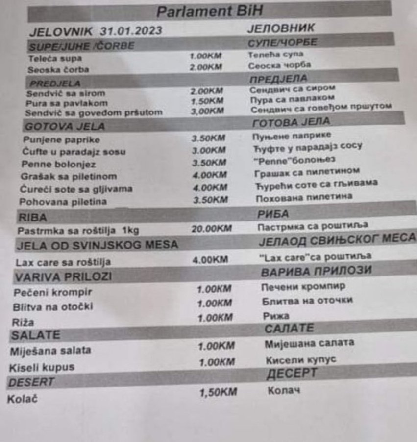 Međutim, to ne vrijedi za državne parlamentarce, koji, ako je suditi prema jelovniku iz restorana Parlamenta BiH koji je objavljen na društvenim mrežama, uprkos enormno visokim primanjimaa i dalje mogu jesti kvalitetno, a jeftino.