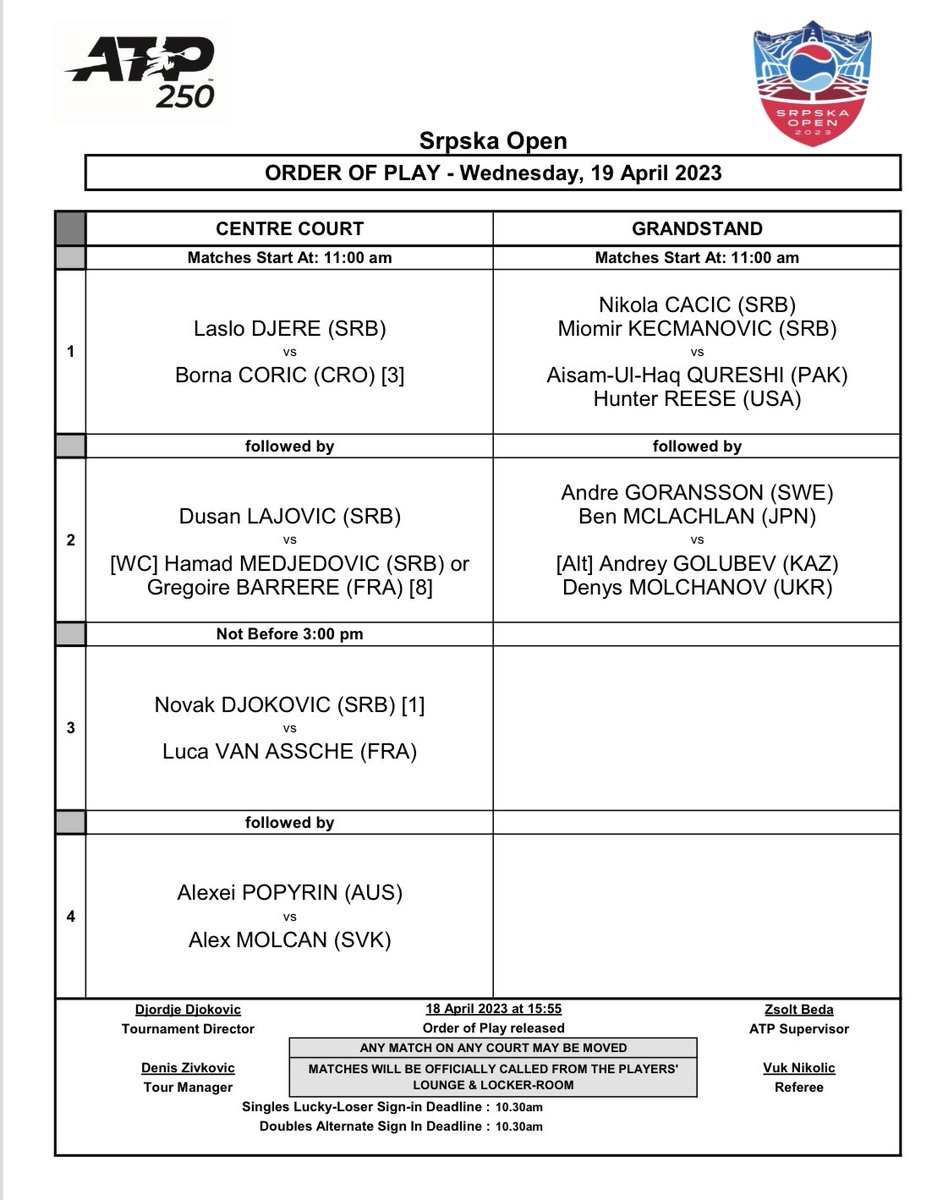 Najbolji svjetski teniser Novak Đoković, na centralni teren u Banjoj Luci u srijedu neće izaći prije 15 časova, jer su prije njega zakazana dva duela.