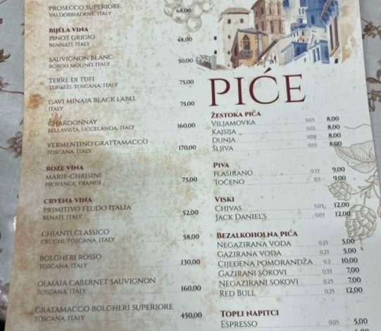 A ako mislite da je to najbesmislenija cijena, treba li da navedemo da je u istom restoranu šolja kiselog mlijeka 10 KM (5 evra)? Tu je i porcija pasulja od 20 evra, hamburger i salata od kiselog kupusa, po 10 evra.