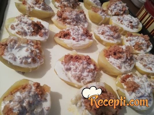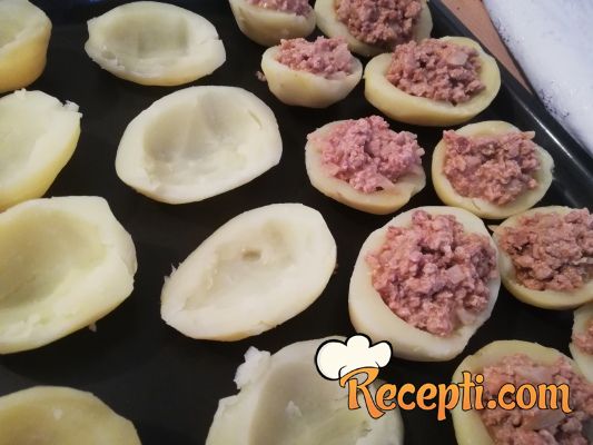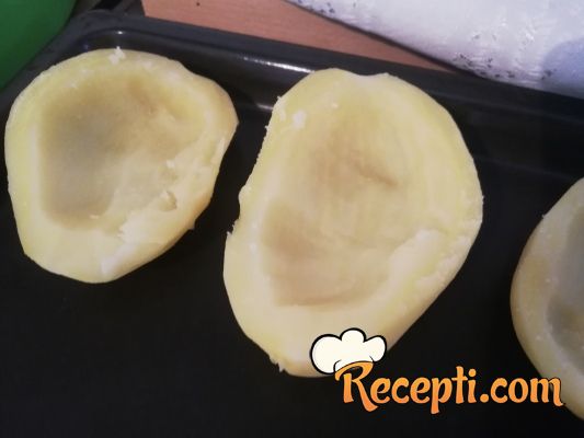 Krompir oguliti i čitav skuhati u slanoj vodi. Zatim ga izvaditi, pa kada se ohladi, prepoloviti ga u sredinu izdubiti kašičicom.