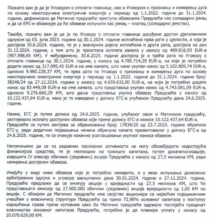 U dopisu Matičnom preduzeću navode da oni taj novac iz redovnih poslovnih aktivnosti ne mogu obezbijediti te su ih pozvali da iskoriste pravo preče kupovine i uplate akcije u iznosu od 20,07 miliona maraka.
