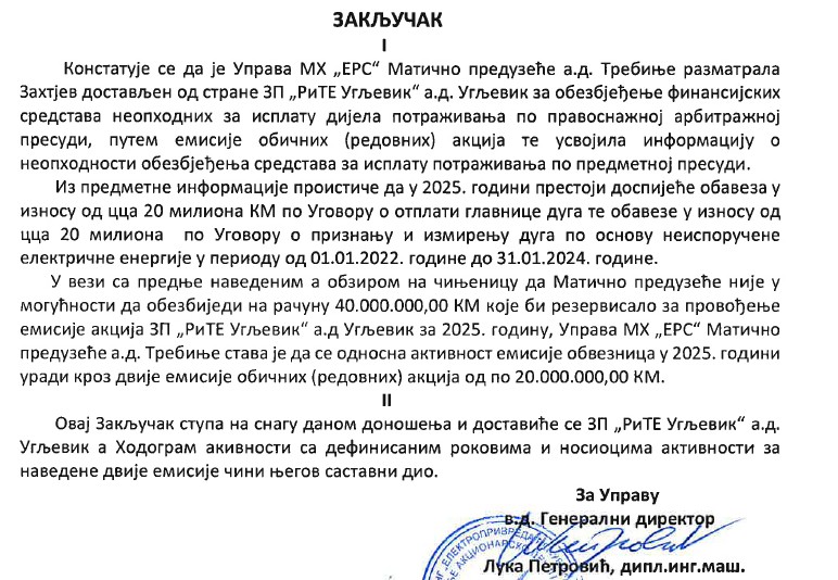 „S obzirom na činjenicu da Matično preduzeće nije u mogućnosti da obezbijedi na računu 40 miliona koje bi rezervisalo za sprovođenje emisije akcija RiTE „Ugljevik“ za 2025. godinu, uprava je stava da se urade dvije emisije akcija od po 20 miliona“, navodi se u zaključku uprave.