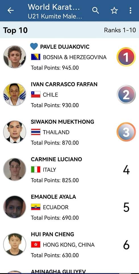 Karatista banjolučke Energije Pavle Dujaković od juče je na vrhu svjetske rang liste u kategoriji do 60 kilograma i do 21 godine.