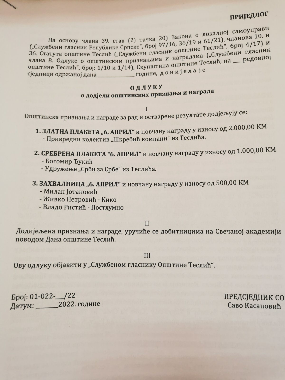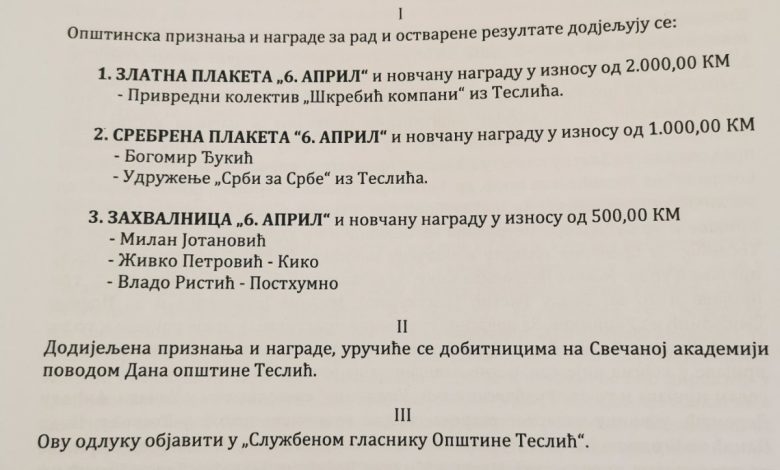 Teslićki parlament dodijelio je danas Zlatnu plaketu „6. april“ i 2.000 maraka fabrici obuće „Škrebić company“ koja je u vlasništvu bivšeg predsjednika Unije udruženja poslodavaca RS i bivšeg vršioca dužnosti direktora Inspektorata RS Dragutina Škrebića.