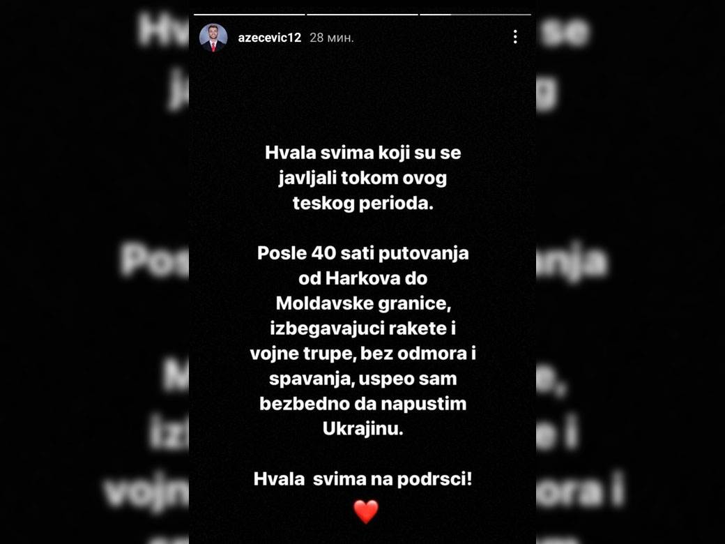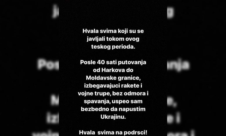 – Hvala svima koji su se javljali tokom ovog teškog perioda. Poslije 40 sati putovanja od Harkova do moldavske granice, izbjegavajući rakete, vojne trupe, bez odmora i spavanja sam uspio bezbjedno da napustim Ukrajinu. Hvala svima na podršci – napisao je Aleksandar.